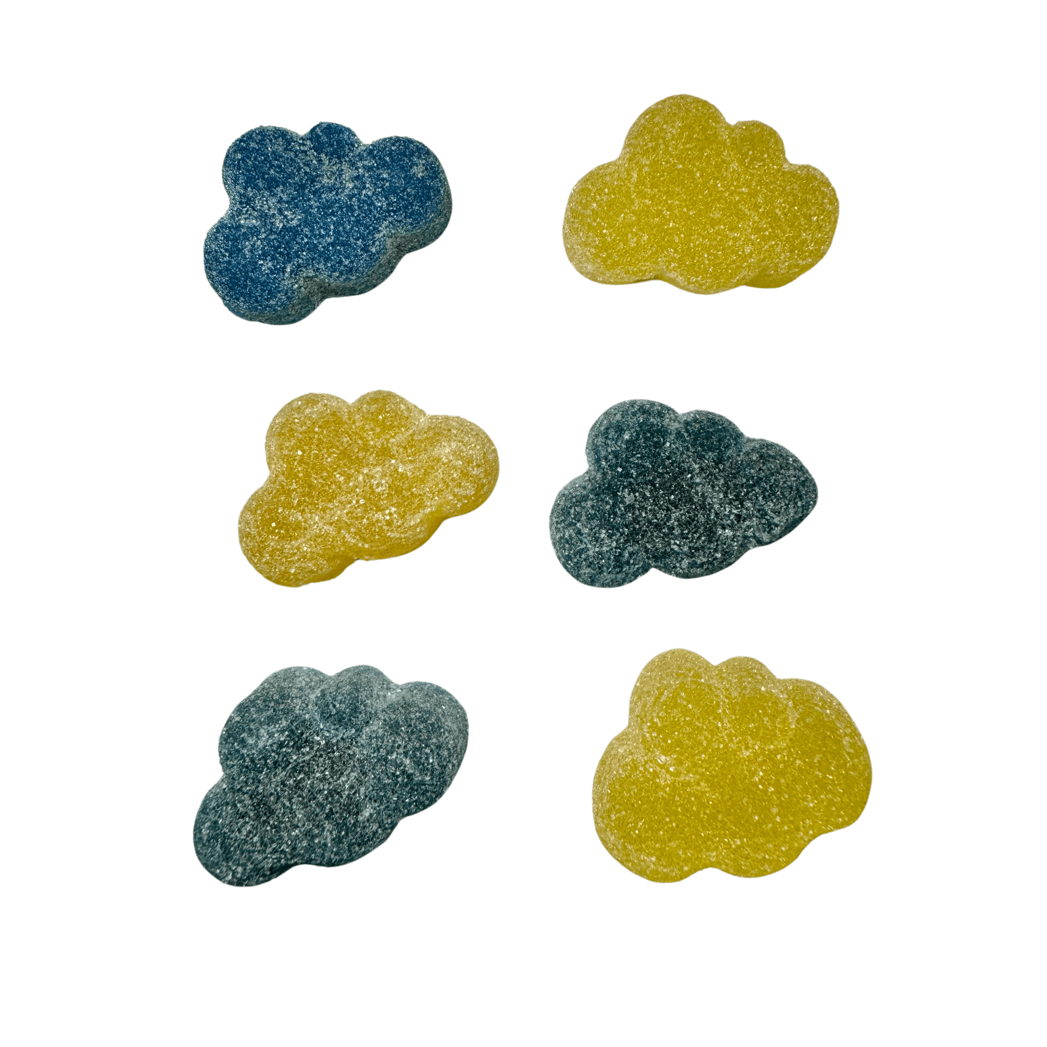 Cloud Bursts, are chewy sugar coated clouds with fruit cocktail flavour. They contain 350mg per pack.